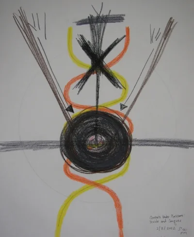 On February 8, the twelfth mandala I drew, “Contents Under Pressure,” hints at the gravity of the circumstances. (There's a circle drawn in pencil on this page, but what I drew isn't within the boundary, so it's not really a mandala. Several of my mandalas have content outside the circles.)